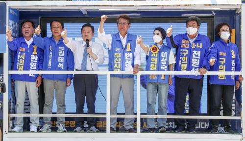 6·1 지방선거를 앞둔 지난달 31일 부산 사하구에서 민주당 변성완 부산시장 후보가 지지를 호소하고 있다. 김종진 기자 kjj1761@“더 반성하고 쇄신하겠습니다.”(더불어민주당 박재호 부산시당위원장) “말로만 반성한 민주당에 민심은 철퇴를 내렸습니다.”(민주당 최인호 사하갑 의원) “저와 민주당이 가야 할 쇄신의 길을 찾겠습니다.”(민주당 전재수 북강서갑 의원)
