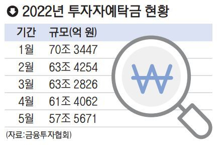 6일 금융투자협회에 따르면, 증시 대기 자금인 투자자예탁금은 올해 5월 57조 5671억 원이다. 올 1월 70조 3447억 원을 기록한 후 2월 63조 4254억, 3월 63조 2826억 그리고 4월 61조 4062억 원으로 4개월 연속 감소하고 있다. 투자자예탁금은 주식을 매수하기 위해 보관하는 증시 대기 자금으로 예탁금 감소는 증시 투자 온도가 지난해보다 차가워졌다는 점을 보여준다.