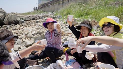 부산 기장군 국립수산과학원 뒤편에 차가 도착하자 넓은 바다가 우리를 맞았습니다. ‘여기 고둥이 어딨지?’ 싶은 순간 어머님들은 일단 앉아 보라며 우리에게 숟가락과 젓가락을 건넵니다. 출발 전 도시락을 준비해야 하는지 묻자 그냥 오라고 한 데는 이유가 있었습니다. 어머님들은 각자 가져온 고사리, 콩나물, 애호박, 도토리묵에 밥을 실컷 넣고 알루미늄 다라이(‘대야’의 일본말)에 비볐습니다. 바위에 쭈그리고 앉아 먹었지만 반짝이는 기장 바다는 호텔 뷰 부럽지 않았습니다. ‘더 묵어라. 그거 먹고 고둥이나 캐겠나?’ 비빔밥 두 그릇에 배가 터질 것 같았지만, 어머님들이 싸 온 음식은 줄어들지 않았습니다. 베트남 커피 두 잔까지 마신 뒤에야 자리에서 일어날 수 있었습니다.