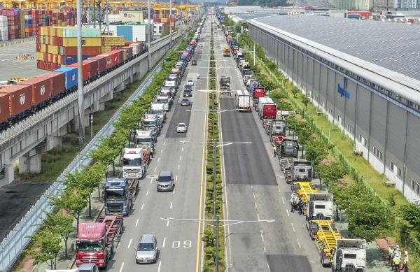 민주노총 공공운수노조 화물연대가 총파업에 돌입한 7일 오전 부산 강서구 부산신항 삼거리 인근 도로에 운행을 멈춘 대형 화물차가 줄지어 서 있다. 김종진 기자 kjj1761@민주노총 공공운수노조 화물연대본부(이하 화물연대)가 7일 총파업에 들어갔다. 화물연대는 안전운임제 일몰제 폐지 등 주요 쟁점과 관련해 정부가 전향적인 자세로 나서지 않는다면 무기한 파업이 불가피하다는 입장을 고수하고 있다. 총파업이 장기화 국면으로 접어들 수도 있다는 우려가 커지면서 부산항을 비롯한 물류 현장에 팽팽한 긴장감이 감돈다.
