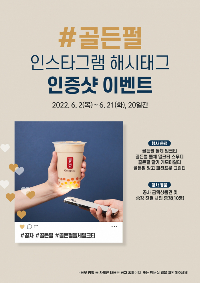 △글로벌 티(Tea) 음료 브랜드 공차코리아가 21일까지 공식 인스타그램 채널에서 골든펄 신메뉴 4종 구매자 대상 '제품 인증샷 이벤트'를 진행한다. 새롭게 선보이는 황금빛 '골든펄' 토핑을 더한 신메뉴인 '골든펄 돌체 밀크티', '골든펄 돌체 밀크티 스무디', '골든펄 딸기 캐모마일티', '골든펄 망고 패션프룻 그린티' 총 4종을 대상으로 진행된다. 전국 매장에서 해당 신메뉴 중 원하는 음료 구매 후, 휴대폰 플래시나 램프 등 조명 위에 음료를 올리고 제품 인증샷을 촬영하면 된다. 인증샷은 개인 인스타그램 계정에 지정된 해시태그와 함께 공개로 업로드하면 이벤트 응모가 완료된다. 골든펄 음료를 휴대폰 플래시 위에 올려 놓으면 '샤이닝 골든펄 모먼트'를 즐길 수 있다. 추첨을 통해 당첨자 총 10명에게는 공차 모바일 금액권 5만 원권과 공차 브랜드 모델 배우 송강의 친필 사인이 담긴 포토카드가 제공된다. 당첨자는 7월 1일 공차 공식 인스타그램을 통해 발표될 예정이다. 신메뉴는 공차 시그니처 토핑인 '타피오카 펄'의 베리에이션이자 새롭게 선보이는 골든펄 토핑이 더해진 음료다. 골든펄 토핑은 쫀득한 펄 특유의 식감은 그대로 살리면서, 달콤한 맛과 향으로 한층 업그레이드 돼 스무디·밀크티, 캐모마일티, 패션프룻 그린티 등 다양한 음료와 최상의 궁합을 자랑한다.