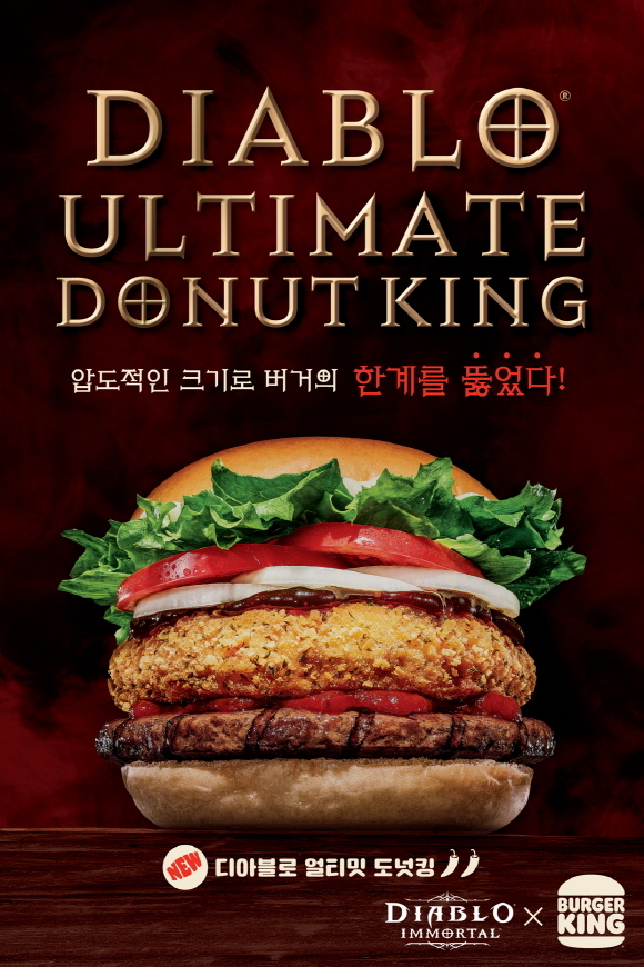 △프리미엄 햄버거 브랜드 버거킹이 '블리자드 엔터테인먼트'의 '디아블로 이모탈'과 다양한 협업 이벤트를 진행한다. 26일까지 진행되는 이번 메인 이벤트는 버거킹과 디아블로 이모탈을 즐길 수 있는 다양한 혜택을 담았다. 특별 웹사이트를 방문한 고객은 방문만으로 '디아블로 얼티밋 도넛킹' 세트업 쿠폰을 받을 수 있다. 특별 웹사이트를 통해 버거킹 앱으로 접속 시 디아블로 이모탈 한정판 굿즈를 받을 수 있는 '디아블로 이모탈 굿즈 럭키 릴레이 이벤트'에도 응모 가능하다. 이벤트를 통해 '해골왕 스태츄', '디아블로 이모탈 헤드폰' 등 한정판 굿즈와 '와퍼 세트 교환권' 등 경품 1000개를 증정한다. 해골왕 스태츄를 뺀 6가지 경품의 경우, 매주 당첨자가 2배씩 늘어나도록 해 풍성하게 즐길 수 있도록 했다. 오는 9일 배민쇼핑라이브도 진행한다. 9일 저녁 7시부터 8시까지 1시간 동안 진행되는 배민쇼핑라이브에서는 정가 1만 5000원의 버거킹 상품권을 1만 2000원에 한정 수량으로 만나볼 수 있다.