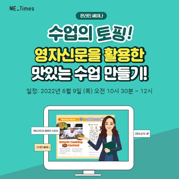 △NE능률의 교육용 영자신문 '엔이타임즈(NE Times)'가 영자신문을 활용한 수업 노하우 세미나를 실시한다. 엔이타임즈는 현직 영어 강사를 초빙해 연령별, 수준별에 맞는 영자신문 고르는 법부터 영자신문을 수업 교재로 활용하는 법까지 다양한 노하우를 알려줄 계획이다. 색다른 학습 자료를 사용하고 싶어 하는 초보 교강사와 학부모들의 궁금증도 해결해줄 예정이다. 이번 세미나는 9일 오전 유튜브 온라인 생중계로 진행된다. 누구나 엔이타임즈 홈페이지에서 신청 가능하며, 사전 예약 시 입장할 수 있는 링크를 예약한 휴대전화 번호로 받아볼 수 있다. 엔이타임즈 홈페이지 가입 후 세미나에 참석하면 엔이타임즈 온라인 1개월 이용권(선착순 50명) 또는 엔이타임즈 12개월 구독권 10% 할인 쿠폰을 받을 수 있다.