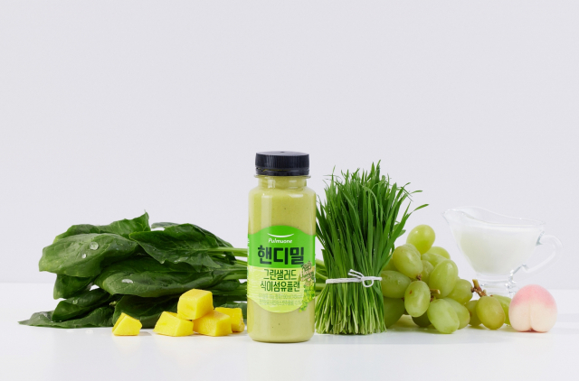 △풀무원녹즙은 신선한 녹색 채소 생즙에 플레인 요거트를 더해 든든하고 건강하게 먹을 수 있는 식사 대용 녹즙 스무디 '핸디밀 그린샐러드 식이섬유플랜'을 출시했다. 하루 한 병으로 바나나 3개 분량의 식이섬유(식품정보 데이터베이스 기준)를 섭취할 수 있는 고식이섬유 녹즙 스무디 음료다. 제품 1병당 10g의 식이섬유가 함유돼 가볍고 건강한 식단을 원하는 이들의 식사 대용으로 안성맞춤이다. 생즙 베이스로는 신선하게 짜낸 녹색 채소 2종(시금치, 밀싹)을 사용했다. 여기에 유산균과 우유만으로 발효한 플레인 요거트를 더해 포만감까지 채웠다. 상큼달달한 샤인머스켓 맛으로 녹즙을 처음 접하거나 생즙 특유의 맛에 익숙하지 않은 이들도 부담 없이 즐길 수 있다. 망고, 복숭아 등의 프리미엄 과일을 갈아 넣어 남녀노소 모두 좋아할 산뜻한 맛으로 완성했다. 풀무원녹즙 네이버 스마트스토어를 통해 만나볼 수 있다. 정기구독 시 풀무원녹즙의 배송 판매원인 모닝스텝으로부터 매일 아침 신선한 상태로 받아볼 수 있다.