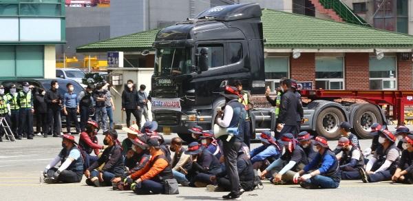화물연대는 8일 오전부터 부산 강서구 부산항 신항에서 선전전을 벌였다. 이 과정에서 일부 조합원이 현행범으로 체포되면서 파업 분위기가 격앙됐다.