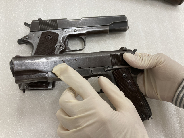 부산조병창에서 만든 국산 콜트 권총. '광복식' '부진제'란 각인이 선명하다. 이재희 기자