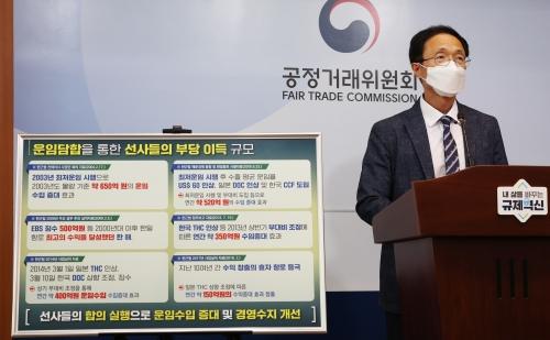 조홍선 공정거래위원회 카르텔조사국장이 9일 오전 정부세종청사에서 국내외 컨테이너 정기선사의 한~일, 한~중 항로 해상운임 담합 제재와 관련해 브리핑하고 있다. 연합뉴스공정거래위원회가 한~일 항로에서 2003년 2월부터 2019년 5월까지 총 76차례 운임을 합의한 15개 선사에 대해 시정명령과 함께 과징금 총 800억 원(잠정)을 부과하기로 결정했다.