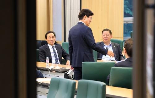 더불어민주당 우상호(왼쪽) 비대위원장이 9일 국회의원회관에서 열린 재선의원 간담회에서 대화를 하고 있다.