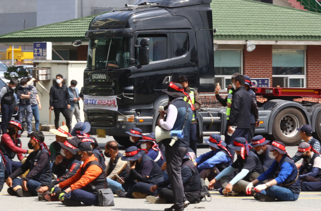 한국 경제, 나아가 세계 경제가 50년 만에 스태그플레이션 공포에 짓눌려 있다. 민주노총 공공운수노조 화물연대 총파업 이틀째인 8일 오후 부산 남구 감만부두 앞에서 화물연대 조합원들이 긴급 투입된 국토교통부 비상수송차량에 대해 운송 중단을 요구하고 있다. 정종회 기자 jjh@