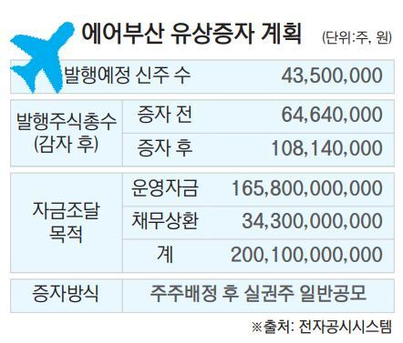 12일 에어부산 등에 따르면 에어부산은 다음달부터 무상감자와 유상증자를 순차적으로 진행한다. 무상감자를 통해 자본금을 현재의 3분의 1로 줄인 후, 이어 신주 발행으로 자본 확충에 나선다는 의중이다. 신주의 예정발행가는 4600원으로 총 2001억원 규모다. 일련의 과정을 통해 자본잠식에서도 벗어날 수 있을 것으로 기대된다. 감자로 잠식률을 낮춘 뒤 자본을 확충하기 때문이다. 에어부산의 1분기 말 기준 자본잠식률은 65.6%, 부채비율은 1431.5%다.