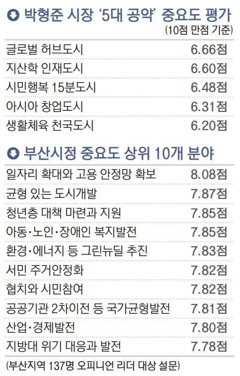 지난 4~9일 부산지역 학계, 시민단체, 보건복지계, 경제·금융계, 문화계, 언론계 등 총 137명을 대상으로 구글 설문양식을 활용해 10점 만점을 기준으로 한 설문조사 결과, 박 시장 5대 공약의 중요도에 관한 질문에선 글로벌 디지털금융도시 조성, 친환경 첨단 수소 항만도시 등 ‘글로벌 허브도시’ 조성이 6.66점으로 가장 높게 꼽혔다.
