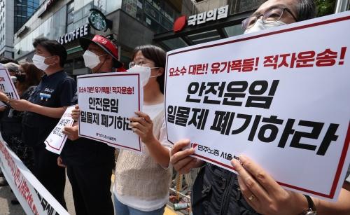 13일 서울 여의도 국민의힘 당사 앞에서 민주노총 주최로 화물연대 총파업을 지지하고, 정부의 대화를 촉구하는 시민·사회단체 기자회견이 열렸다. 연합뉴스여야가 13일 안전운임제 유지를 주장하며 화물연대가 일주일째 총파업을 이어가는 것과 관련해 책임 공방을 주고받았다. 국민의힘은 화주와 화물차주 간 조정은 정부의 역할로, 여당이 관여할 사안이 아니라는 입장인 반면, 더불어민주당은 정부와 여당이 책임을 미루고 있다고 비판했다.