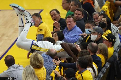 14일 미국 캘리포니아주 샌프란시스코의 체이스센터에서 열린 2021-2022 미국프로농구(NBA) 챔피언결정전 골든스테이트 워리어스와 보스턴 셀틱스의 5차전에서 골든스테이트의 드레이먼드 그린이 공을 잡기 위해 관중석으로 뛰어들고 있다. 골든스테이트가 보스턴에 104-94로 이기며, 시리즈 전적 3승 2패로 우승까지 1승만 남겨 두게 됐다. AFP연합뉴스