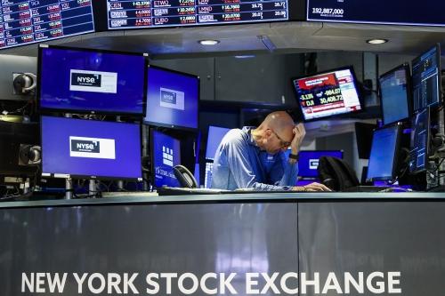 13일(현지시간) 미국 증시가 폭락한 가운데 뉴욕증권거래소(NYSE) 입회장 포스트에서 한 트레이더가 업무를 처리하다가 이마를 괴고 있다. 연합뉴스코스피가 미국 물가 충격 여파로 전날에 이어 14일도 하락하며 ‘심리적 저항선’으로 여겨졌던 2500선을 내줬다.
