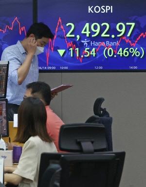 14일 서울 중구 하나은행 딜링룸에서 딜러들이 업무를 보고 있다. 이날 코스피는 2492.97에 마감했다. 코스피가 종가 기준으로 2500선 아래로 떨어진 것은 1년 7개월 만에 처음이다. ▶관련 기사 5면 연합뉴스