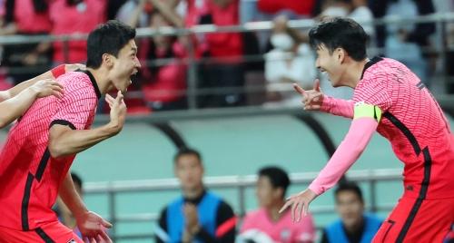 한국 축구 대표팀이 14일 서울 마포구 서울월드컵경기장에서 이집트를 상대로 한 평가전에서 4-1로 이긴 가운데 조규성(왼쪽)이 팀 세 번째 골을 넣은 뒤 손흥민과 환호하고 있다. 연합뉴스한국 축구 대표팀이 이집트전을 끝으로 6월 평가전 4연전을 마무리했다. 2주간 이어진 평가전 동안 수비와 미드필더진에서 불안감을 노출한 점은 11월 카타르 월드컵 본선까지 해결해야 할 과제로 떠올랐다. 반면, ‘월드 클래스’ 손흥민(토트넘 홋스퍼)의 존재감은 더욱 빛났다.