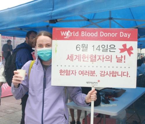 지난 14일 ‘2022년 해운대구민 현혈자의 날’ 기념행사에서 피켓을 들고 있는 외국인 참가자. 대한적십자사 부산혈액원 제공부산 해운대구 헌혈자가 부산 구·군 중 유일하게 코로나19 이전보다 오히려 더 늘어난 것으로 확인됐다. 전국 기초지자체 중 최초로 헌혈의 날을 정하고 특별 주간을 운영하면서 적극적으로 헌혈을 독려한 것이 주효했다는 분석이다.