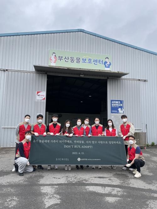 시그니엘 부산 직원 11명은 15일 개관 2주년 기념과 ESG 경영 실천의 일환으로 부산 강서구 부산동물보호센터에서 유기동물을 위한 자원봉사활동을 벌였다.