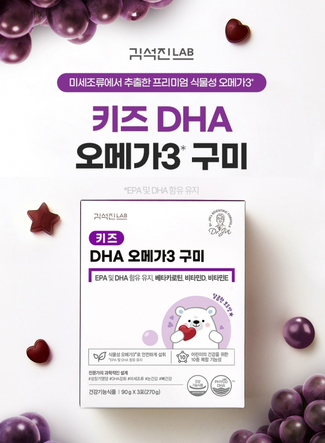 △바이오일레븐의 건강기능식품 브랜드 김석진랩이 키즈 DHA 오메가3 구미를 출시한다. 구미형 식물성 오메가3로 성장기 어린이에게 필수 영양 성분인 불포화지방산 DHA를 강화했다. 미세조류에서 친환경적 저온수 효소 추출 공법을 사용해 중금속 걱정 없는 식물성 오메가3로 만들어 안심하고 섭취할 수 있다. 핵심원료인 식물성 오메가3는 한국 비건인증원으로부터 비건 인증도 취득했다. EPA·DHA 함유 유지와 더불어 눈 건강에 좋은 베타카로틴과 뼈 건강에 좋은 비타민D를 배합해 어린이의 생활습관을 고려한 영양성분을 설계했다. 아이들이 거부감 없이 즐겁게 섭취할 수 있도록 새콤달콤한 포도맛에 귀여운 해달별 모양의 구미 형태로 만들었다. 오는 30일까지 키즈 멀티비타민을 구매할 경우 키즈 DHA 오메가3와 드시모네 키즈 유산균 등 3만 1000원 상당의 체험팩을 증정하는 프로모션도 진행하고 있다. 드시모네 공식몰과 네이버 스마트스토어, 주요 온라인 쇼핑몰 등에서 구매할 수 있다.