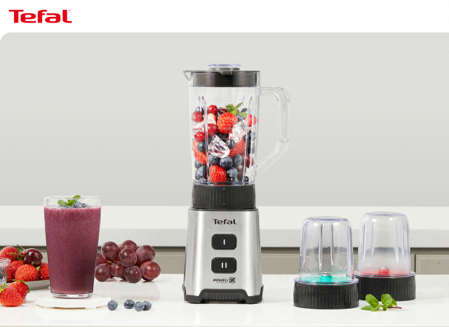 △테팔이미니 믹서기 라인업을 한층 더 업그레이드해 선보인다. 이번에 출시된 테팔 미니 믹서기 '미니믹스'와 '펄스'는 자사 미니 믹서기 사상 가장 강력한 스펙의 제품이다. 400W의 파워 모터와 테팔만의 파워엘릭스 기술의 4중 입체 칼날로 더욱 곱고 빠른 분쇄를 자랑한다. 전체 용량 기준, 기존보다 100mL 늘어난 700mL의 권장 사용량으로 믹서 용기의 컴팩트함은 그대로 유지하면서 블렌딩 한 번에 주스 3~4잔도 손쉽게 완성할 수 있도록 했다. 용기 손잡이가 추가돼 식재료 블렌딩 후, 흘릴 걱정 없이 간편하게 내용물을 따라낼 수 있다. 2단계 세분화된 속도 조절 버튼으로 재료에 따라 개인의 취향에 맞는 분쇄 정도를 선택할 수 있다. 용기 재질에 따라 트라이탄과 유리(글라스)로 각각 만나볼 수 있다. 트라이탄 재질의 믹서 용기는 환경 호르몬 '비스페놀 A (BPA)'가 불검출되는 안전한 소재로 긁힘, 색 배임에 강해 얼음이나 블루베리 등 단단하거나 진한 색상의 식재료도 안심하고 사용할 수 있다. 휴대용 텀블러, 다지기, 분쇄기 등 제품에 따라 구성된 추가 액세서리를 고려해 필요에 따라 폭넓게 선택 가능하다.