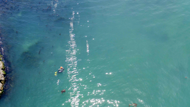 부산 기장군 연화리 앞바다에서 기장 해녀가 테왁을 들고 물질하고 있다. 정윤혁 PD jyh6873@busan.com
