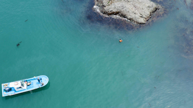 기장군 연화리 앞바다에서 물질한 해녀를 태우기 위해 선박이 다가가고 있다. 정윤혁 PD jyh6873@busan.com
