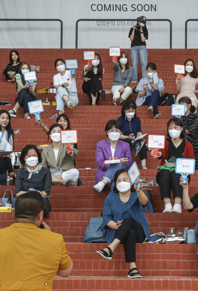 밀락더마켓에서 17일 열린 '코로나 최전선에서 싸운 의료진을 위한 힐링 이벤트' 참가한 코로나 의료진들이 경매 형식으로 기념품을 증정하는 행사에 참여하고 있다. 김종진 기자 kjj1761@