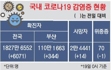 한편 부산시는 19일 0시 기준 신규 확진자 344명이 발생해 나흘째 하루 확진자가 500명 미만이라고 밝혔다. 지난 일요일이었던 12일 417명보다 18%가량 감소한 규모다. 이날 0시 기준 경남과 울산에선 각각 374명과 243명의 신규 확진자가 나왔다. 국내 전체 신규 확진자는 6071명으로, 열흘 연속 1만 명 아래를 기록했다.
