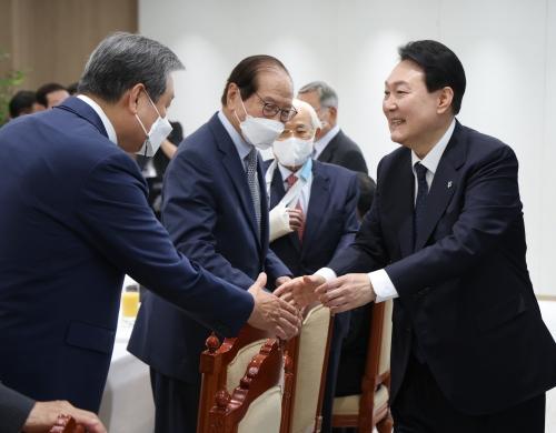 윤석열 대통령이 21일 서울 용산 대통령실 청사에서 열린 국민의힘 상임고문단 오찬 간담회에서 참석자들과 악수하고 있다. 김무성 전 새누리당 대표, 황우여 전 사회부총리 등 20여 명이 참석했다. 연합뉴스