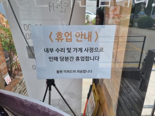 최근 집단식중독이 발생한 김해 유명 냉면집에 23일 휴업 안내문이 붙어 있다.경남 김해시 한 유명 냉면집에서 지난달 중순께 냉면을 먹은 손님 30여 명이 집단 식중독에 걸린 사실이 뒤늦게 알려졌다. 이들 가운데 60대 남성이 숨진 것으로 파악돼 보건 당국과 경찰이 조사에 나섰다.