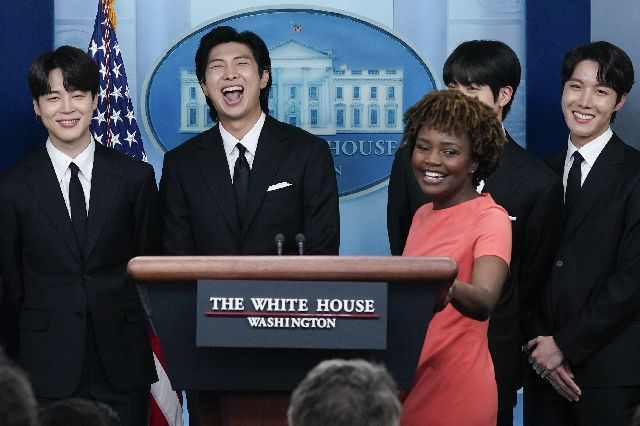 백악관 브리핑룸에서 환하게 웃는 BTS. 부산일보DB