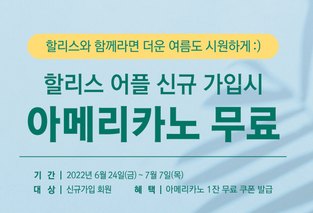 △라이프스타일 브랜드 할리스가 앱 신규 가입 회원들을 대상으로 아메리카노 무료 증정 프로모션을 실시한다. 할리스 공식 앱인 '할리스 멤버십 앱'에 새롭게 가입하는 회원에게 환영하는 마음을 전하고, 본격적인 여름철을 맞아 더위에 지친 고객에게 즐거움을 선사하기 위해 기획됐다. 프로모션은 24일부터 7월 7일까지 진행된다. 프로모션 기간 동안 할리스 멤버십 앱을 통해 '멤버십 가입'을 진행할 경우, 쿠폰함에 자동으로 아메리카노 레귤러 사이즈 1잔 무료 쿠폰이 발급된다. 또 기존 멤버십 회원들도 할리스 아메리카노를 무료로 즐길 수 있는 '할리스 레드데이(HOLLYS RED DAY)' 프로모션을 진행한다. 27일부터 7월 11일까지 매주 월요일마다 '할리스 멤버십 앱'으로 배달 주문하는 모든 고객은 '아이스 아메리카노' 레귤러 사이즈 한 잔을 무료로 받을 수 있다.
