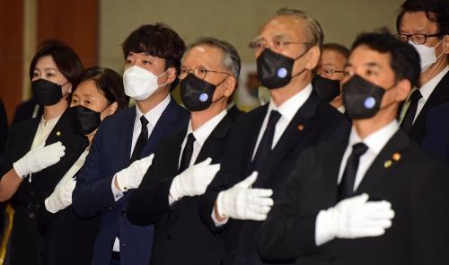 국민의힘 이준석(왼쪽 세 번째) 대표가 26일 서울 용산구 백범김구기념관에서 열린 백범 김구 선생 제73주기 추모식에서 국기에 대한 경례를 하고 있다. 국회사진기자단더불어민주당이 국회 법제사법위원장 자리를 국민의힘에 넘기겠다고 밝히면서 21대 국회 후반기 원 구성 협상이 새로운 국면으로 접어들었다. 민주당이 법사위 양보 조건으로 내건 사법개혁특별위원회 구성에 대해 국민의힘이 일단 반대하면서 기 싸움이 이어졌지만, 민주당의 ‘법사위 제안’을 기점으로 여야 간 물밑 접촉이 본격화할 것으로 보인다.