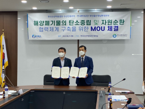 한국수산자원공단(FIRA) 수산진흥본부(본부장 지일구)와 한국환경공단 부산울산경남환경본부(본부장 김동운)가 21일 한국수산자원공단 1층 중회의실에서 해양폐기물의 탄소중립 및 자원순환 협력체계 구축을 위한 MOU를 체결하였다고 27일 밝혔다.