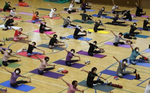 27일 부산 금정구 부산외대 체육관에서 열린 ‘인디아센터 개원식 및 2022 세계 요가의 날 페스티벌’에서 참가자들이 요가 시연 프로그램을 따라 동작을 익히고 있다. 정종회 기자 jjh@