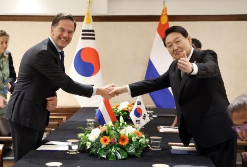 북대서양조약기구 정상회의 참석을 위해 스페인을 방문 중인 윤석열 대통령이 29일(현지시간) 마드리드 시내 한 호텔에서 열린 한·네덜란드 정상회담에서 마르크 뤼터 네덜란드 총리와 기념촬영을 하고 있다. 연합뉴스윤석열 대통령의 첫 해외순방인 북대서양조약기구(NATO·나토) 정상회의 참석을 계기로 현 정부의 외교정책 기조가 대폭 전환될 조짐을 보인다. 경제외교의 무게 중심을 유럽으로 이동하고, 지난 정부에서 꽉 막혔던 한·일관계를 복원하는 데 초점을 맞추고 있다는 것이다.