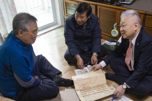 김옥계 장군의 장손(왼쪽부터)과 김부윤 부산대 명예교수, 김종수 씨가 ‘김가정방록’을 두고 얘기를 나누는 모습. 비온후 제공“임진왜란 25의용으로 대변되는 수영의 올곧고 뜨거운 정신이 널리 알려지기를 바랍니다.”