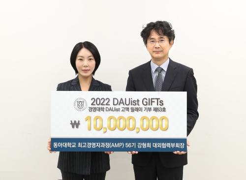 동아대학교(총장 이해우) 최고경영자과정(AMP) 56기 강형희(왼쪽) 대외협력부회장이 27일 경영대학(학장 김현준·오른쪽) 발전과 교육혁신을 위한 다우이스트 기프트 고액 릴레이 기부 제53호 주자로 1000만 원을 기부했다.
