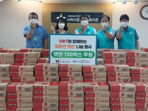 KT부산법인고객담당(상무 남상임)은 최근 사하구 괴정동 사하사랑채노인복지관(관장 윤현주)에 식료품 150상자를 후원했다.