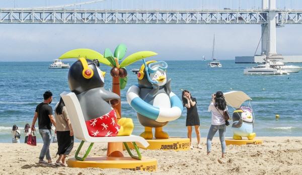 부산 7개 해수욕장 전면 개장을 하루 앞둔 30일 오후 부산 수영구 광안리해수욕장 백사장에 인기 캐릭터인 펭수 모형이 설치돼 피서객들의 눈길을 사로잡고 있다. 김종진 기자 kjj1761@
