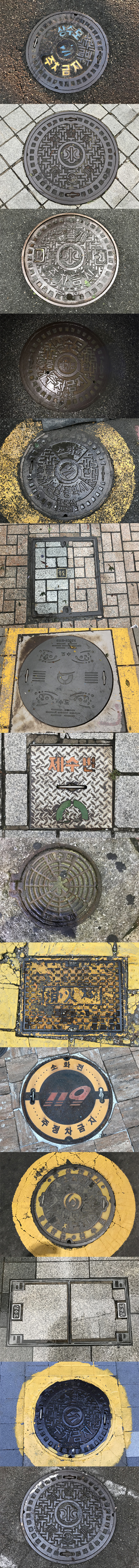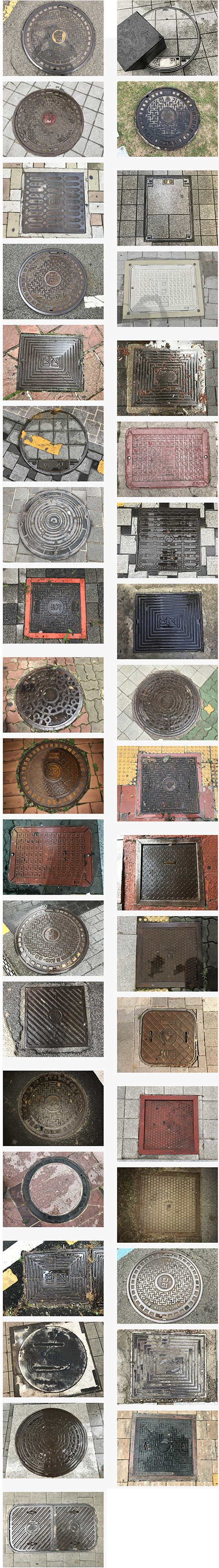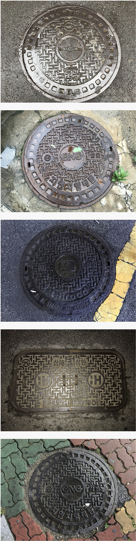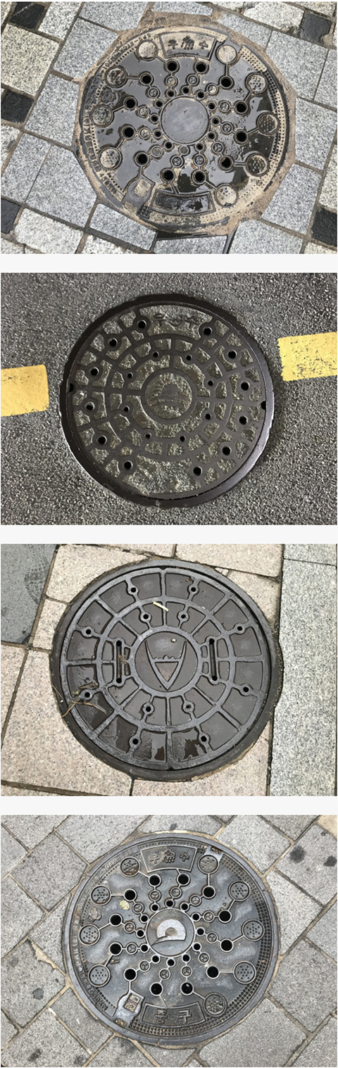 맨홀 뚜껑이라고 다 똑같은 건 아니다. 뚜껑 표면을 자세히 보면 여러 가지 기하학적인 문양이 요철 형태로 새겨져 있다. 미관상의 목적도 있지만, 사람과 차량이 뚜껑 위에서 미끄러지지 않게 마찰력을 높이려는 기능이 강하다. 맨홀 뚜껑은 비와 눈에도 부식이 적어야 하고 대형 차량의 무게까지 이겨내며 쉽게 파손되지 않도록 단단한 주철로 제작돼 내구성이 뛰어나다. 뚜껑에는 그 용도와 함께 설치·관리 기관의 휘장과 로고, 제원, 제조업체 명칭 등이 표시돼 있어 쓰임새와 설치 시기를 알려 준다. 오랜 세월을 묵묵히 버티고 있는 맨홀 뚜껑 자체는 한 도시, 특정 지역의 역사가 되는 셈이다.