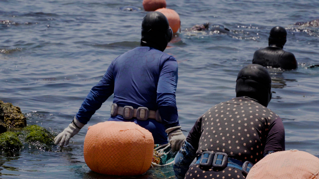 강한 바람에 당황했던 순간도 있었다. 물질을 하다가 갑자기 비가 많이 내린 날이었다. 해무도 많이 낀 걸로 기억한다. 해녀들은 뭉쳐서 다니는데 강한 비바람에 모두 제대로 헤엄칠 수 없었다. 옆에 낚싯배도 있었던지라 더 놀랄 수밖에 없었다. 평소에도 해녀들은 테왁을 띄워놔도 배가 옆으로 지나가는 아찔한 순간을 종종 맞이한다.