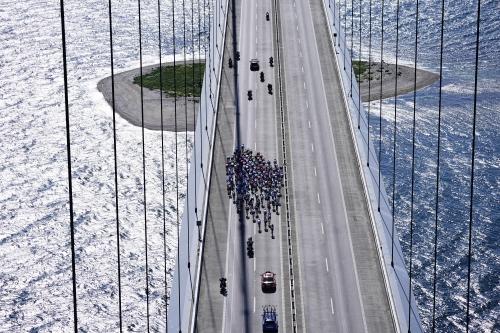 3일(한국시간) 덴마크 로스킬레에서 뉘보르까지 약 199km를 달리는 2022 투르 드 프랑스 사이클대회 2구간 경기에서 선수들이 그레이트 벨트 브리지를 건너고 있다. 약 2년 전 이 대회에서 사고로 두개골이 함몰되는 중상을 입은 파비오 야콥센(네덜란드)이 2구간 1위를 차지하며, 성공적인 재기를 알렸다. EPA연합뉴스