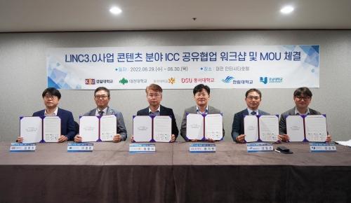 동서대학교(총장 장제국) LINC 3.0사업단은 최근 대전 인터시티호텔에서 5개 권역, 6개 대학(경일대·대전대·동국대·동서대·한림대·호남대) 간 ‘콘텐츠 분야 ICC 공유·협업 활성화 업무협약’을 맺었다.