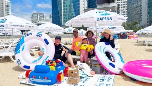 부산 해운대해수욕장을 찾은 피서객 가족이 대선주조(주)가 제작한 비치 파라솔·튜브와 함께 즐거운 시간을 보내고 있다. 대선주조는 휴가철을 맞아 월드엑스포 부산 유치 염원을 담은 비치 파라솔 1500개와 튜브 2000개를 해운대해수욕장에 비치했다고 4일 밝혔다. 대선주조 제공