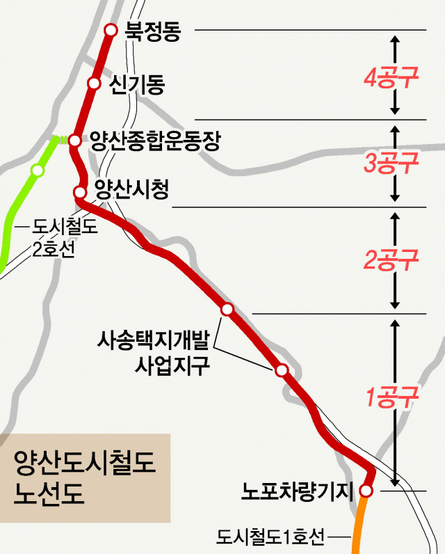 시는 총연장 11.43km인 양산선의 원활한 공사를 위해 전체를 4개 공구로 나눴다. 1·3공구는 설계부터 시공까지 함께하는 턴키방식으로 2018년 2월과 2017년 10월 각각 공사에 들어갔다.