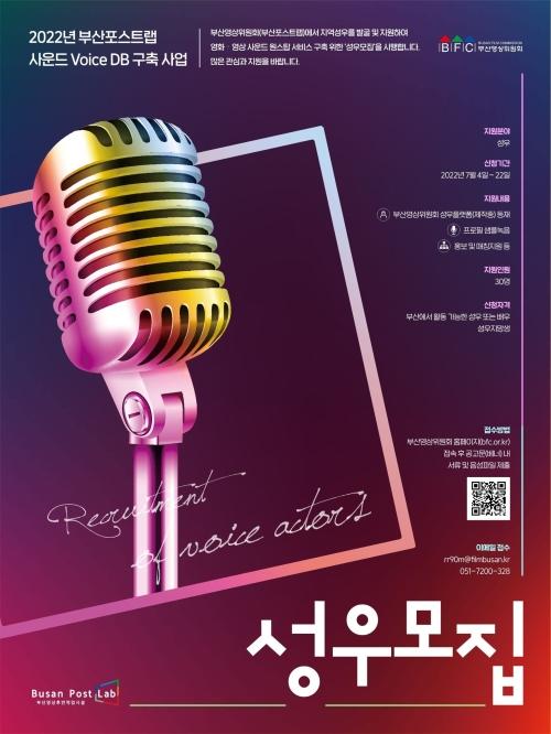 부산영상위원회가 ‘2022년도 부산포스트랩 사운드 보이스 DB 구축 사업’을 통해 지역 성우를 발굴하고 지원한다.