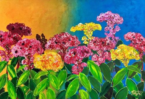 도혜영 작가는 “붉은 맨드라미꽃에서 강렬한 느낌, 마치 춤추는 무용수를 보는 것 같은 느낌을 받았다”고 했다. 그는 7~8월 뜨거운 태양 아래 꽃을 피우고, 가을까지 이어지는 맨드라미에 매력을 느꼈다. 도 작가의 개인전 ‘언페이딩 러브 앤 패션(Unfading love and Passion)’은 부산 동래구 스페이스움에서 30일까지 열린다.