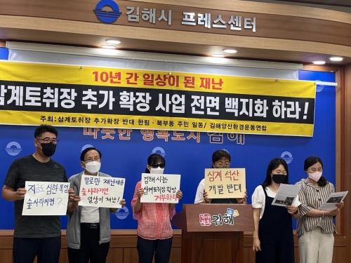 김해양산환경운동연합과 삼계동 일원 주민들은 5일 김해시청 브리핑룸에서 기자회견을 갖고 “토취장 개발로 인해 지금도 소음과 비산먼지 등으로 큰 피해를 입고 있는데 또다시 추가 개발을 추진하고 있다”며 “즉시 백지화하라”고 주장했다.