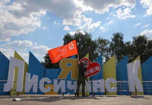 4일(현지시간) 우크라이나 동부 루한스크주 리시찬스크 시내에서 ‘사랑해요 리시찬스크’(I Love Lysychansk)라고 적힌 대형 글자판 앞에서 친러시아 반군 병사가 2차 세계대전 당시 옛 소련군이 사용한 승리 깃발을 들고 있다. 러시아군과 친러시아 분리주의 반군 세력은 전날 루한스크 지역을 완전히 장악했다고 발표했다. 로이터연합뉴스러시아가 루한스크 지역을 점령하면서 전쟁 명분으로 내세웠던 ‘돈바스 해방’에 한걸음 다가서자 일각에선 ‘휴전’에 대한 기대감이 높아지고 있다. 하지만 최근 러시아가 하르키우와 키이우 등에 대한 공습을 재개하면서 러시아가 여기서 그치지 않고 돈바스 이상을 추구할 것이란 분석도 만만찮다.